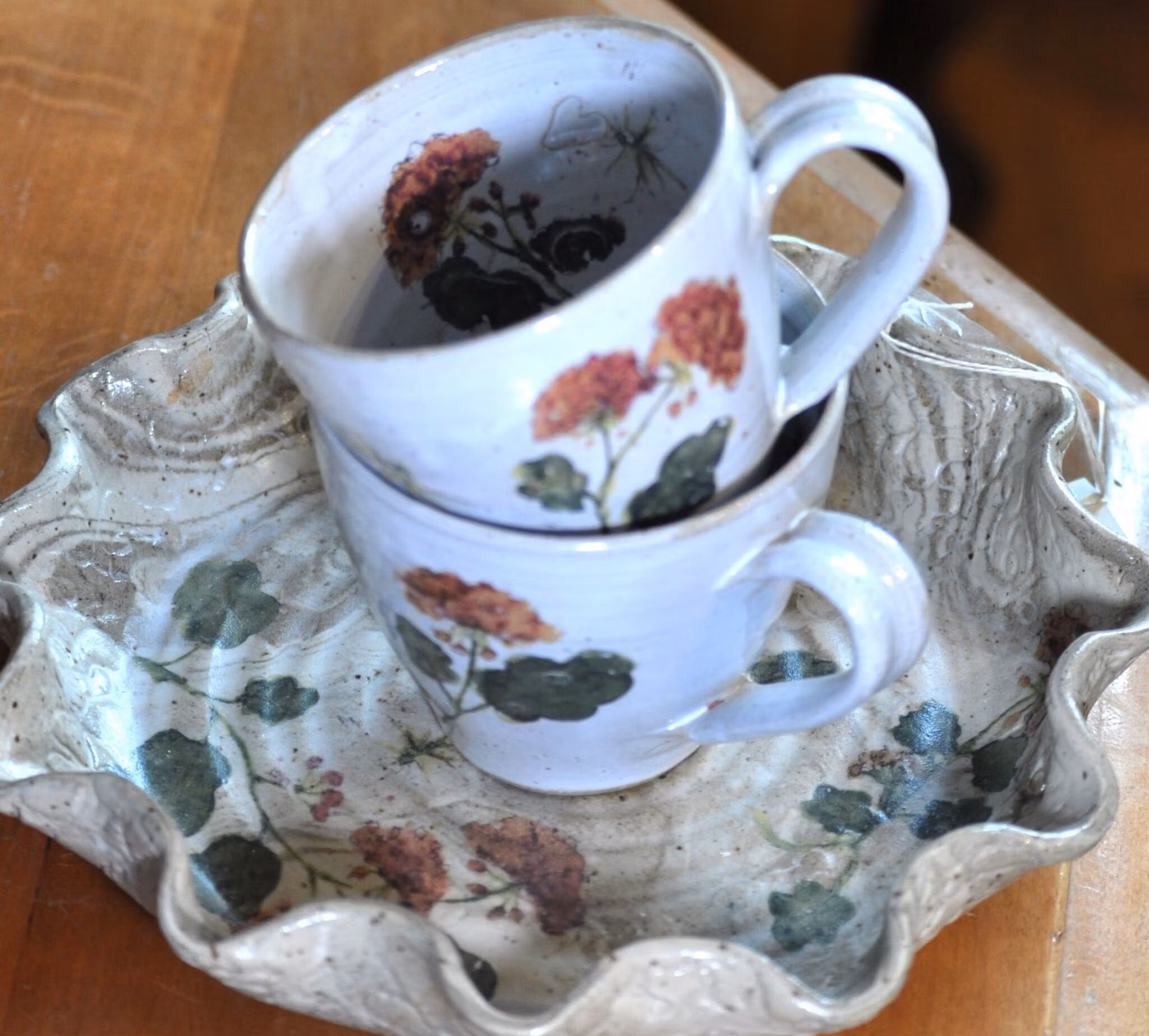 Drejade i återvunnen lera med vit blank glasyr och mönstring med ljuva pelargoner och sländor